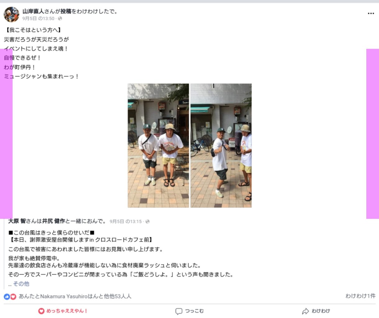 冷蔵庫が使えず食材を廃棄せざるを得ない飲食店さんが、それなら停電で困ってる人も多い市民のみなさんに激安で提供しよう!みんなに元気と笑顔を届けよう!