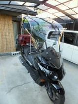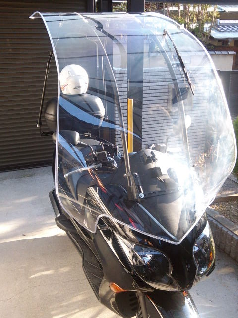 通常の屋根付きバイクより屋根が広く作ってくれているので、停車中に足をついても屋根からの雫で足が濡れないぞ!
